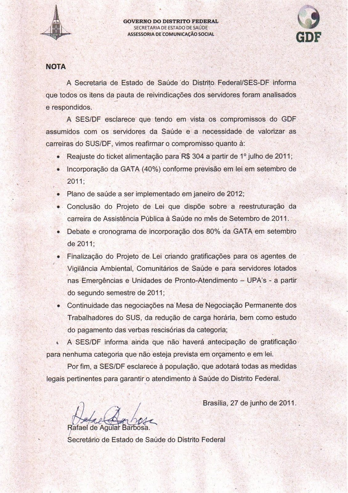 Durante as manifestações no ano passado (2011), o Secretário de Saúde do Distrito Federal, Dr. Rafael Barbosa em nome do GDF, emitiu nota aos servidores e à população do Distrito Federal, figura abaixo, apresentando proposta com 7 itens, que contemplavam pelo menos em parte as reivindicações da categoria, entre quais:
