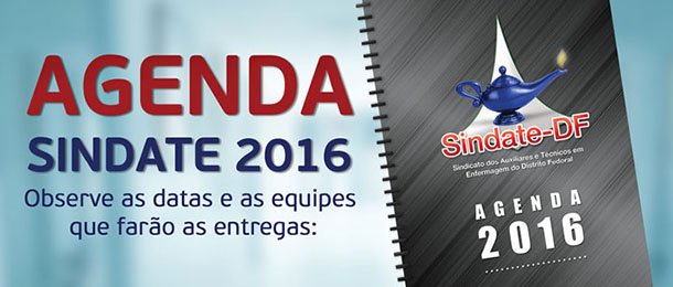 O Sindate informa que entre os dias 04 a 15 de janeiro a equipe de divulgação do sindicato estará entregando as agendas 2016 nos hospitais regionais e centros de saúde. Os delegados das regionais que quiserem ajudar serão bem vindos.