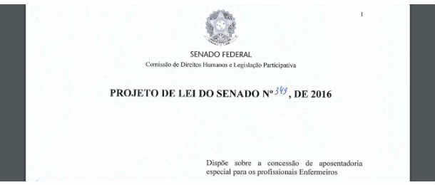 Está tramitando no Senado Federal o projeto de lei de número 349/16 que prevê aos Enfermeiros a aposentadoria especial aos 25 anos de trabalho na área de saúde, uma vez que os profissionais de enfermagem exercem atividade com riscos físicos e biológicos.