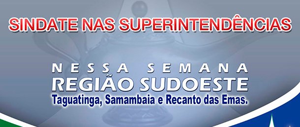 Nesta semana do dia 16/01 a 20/01,  a direção do Sindate iniciou uma atividade nas superintendências da Secretaria de Estado de Saúde, que tem como objetivo fazer um levantamento dos problemas nos serviços dentro das unidades e tentar buscar soluções juntos às superintendências, além de mostrar à população os serviços prestados pelos servidores da SES-DF. Essa semana a direção se encontra na região de Saúde Sudoeste que corresponde a Taguatinga, Samambaia e Recanto das Emas.