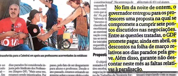 Trecho da matéria que embasa o comprometimento do governador. “No fim da noite de ontem, o governador entregou para os professores uma proposta na qual se compromete a cumprir sete pontos discutidos nas negociações. Entre as questões tratadas, o GDF promete pagar, ainda em abril, os descontos na folha de março relativos aos dias parados pela greve. Além disso, garante não descontar neste mês as faltas relativas à paralisação”.