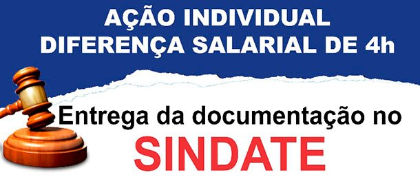 Portanto, aqueles que tiverem interesse em entrar com a ação individual da diferença salarial de 4h, deverão comparecer na Sede do SINDATE, munidos da documentação necessária. Os que não tiverem interesse, poderão aguardar a ação coletiva que está andamento.