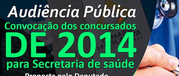 O Sindate convida todos os concursados a participarem da Audiência Pública que irá debater a convocação dos Concursados de 2014 para Secretaria de Estado de Saúde(SES-DF).  A Audiência Pública é proposta pelo Deputado Wasny de Roure (PT) e será realizada na próxima segunda-feira (12/06), às 10h, no auditório da CLDF.