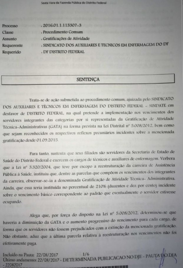 O Tribunal de Justiça do Distrito Federal e dos Territórios (TJDFT), por meio da 6º Vara da Fazenda Pública do DF, julgou procedente a ação coletiva, impetrada pelo Sindate, de incorporação da Gratificação de Atividade Técnico-Administrativa (GATA) ao vencimento dos auxiliares e técnicos em enfermagem.