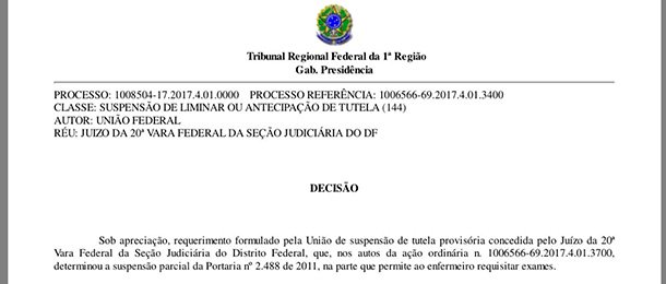 O presidente do Tribunal Regional Federal da 1ª Região atendeu ao pedido da Advocacia-Geral da União e derrubou a liminar que impedia a requisição de exames por enfermeiros, prejudicando o atendimento a pacientes do Sistema Único de Saúde (SUS), a liminar agora se encontra suspensa até o julgamento do mérito do processo. Confira a decisão do TRF da 1ª Região.