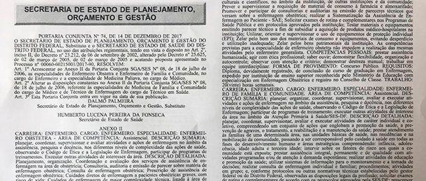 A portaria em questão foi feita em conjunto com a Secretaria de Planejamento, Orçamento e Gestão que alterou as disposições constantes no Anexo II da Portaria Conjunta SGA/SES Nº 08, de julho de 2006, referente às especialidades de Técnico em Enfermagem do cargo Técnico em Saúde especificando, de forma bastante detalhada, quais seriam as novas atribuições do técnico em enfermagem.