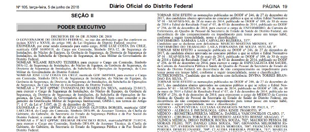 A Secretaria Estado de Saúde (SES-DF) divulgou, nesta terça-feira (05/06), por meio do Diário Oficial do Distrito Federal (DODF), a partir da página 19, a nomeação de 1.052 concursados. Veja aqui. Essa nova convocação preenche as vagas das vacâncias de aposentadorias, exonerações e principalmente dos aprovados que não tomaram posse na última chamada.