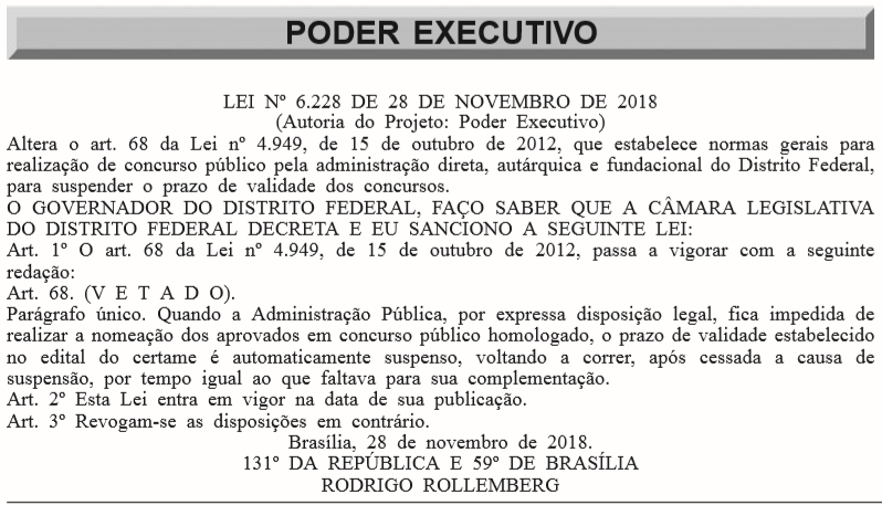 O governador Rodrigo Rollemberg (PSB), sancionou a Lei nº 6.228/2018, que altera as normas de concursos públicos do Distrito Federal. A lei institui a suspensão da contagem do prazo de concursos públicos quando a administração pública for impedida de nomear aprovados para cumprimento da Lei de Responsabilidade Fiscal (LRF), por exemplo, o prazo de validade estabelecido no edital do certame é suspenso automaticamente, voltando a correr por tempo igual ao que valia antes em que o GDF esteve impedido de contratar, devido a LRF.