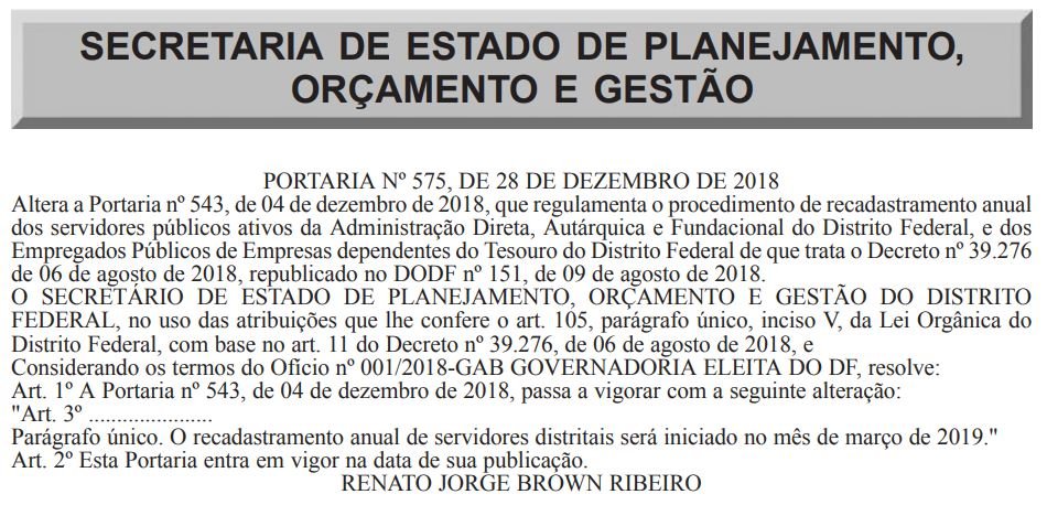 Na última sexta-feira (28/12), a SEPLAG publicou a , que altera a , que regulamenta o procedimento de recadastramento anual de que trata o Decreto nº 39.276 de 06 de agosto de 2018, alterando a data do início do recadastramento de 1º de janeiro para 1º de março de 2019.