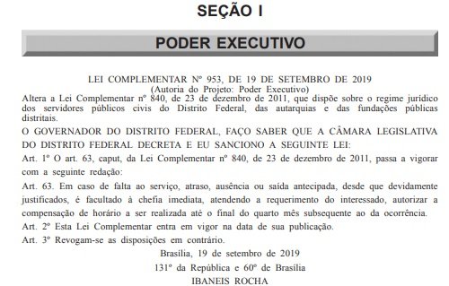 A alteração na Lei Complementar nº 840 foi publicada nesta sexta-feira (20) no Diário Oficial do DF, por meio da Lei Complementar nº 953, de 19 de setembro de 2019. A mudança no prazo de compensação do horário foi uma das reivindicações entregues ao governador do DF, Ibaneis Rocha.