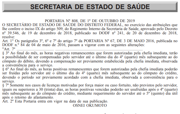 A alteração na Portaria Nº 67, que dispõe sobre os critérios para o controle eletrônico e a aferição de frequência dos servidores da SES foi publicada nesta quinta-feira (03) no Diário Oficial do DF, por meio da Portaria Nº 808 de 01/10 que altera os parágrafos 3º, 6º e 7º da legislação.