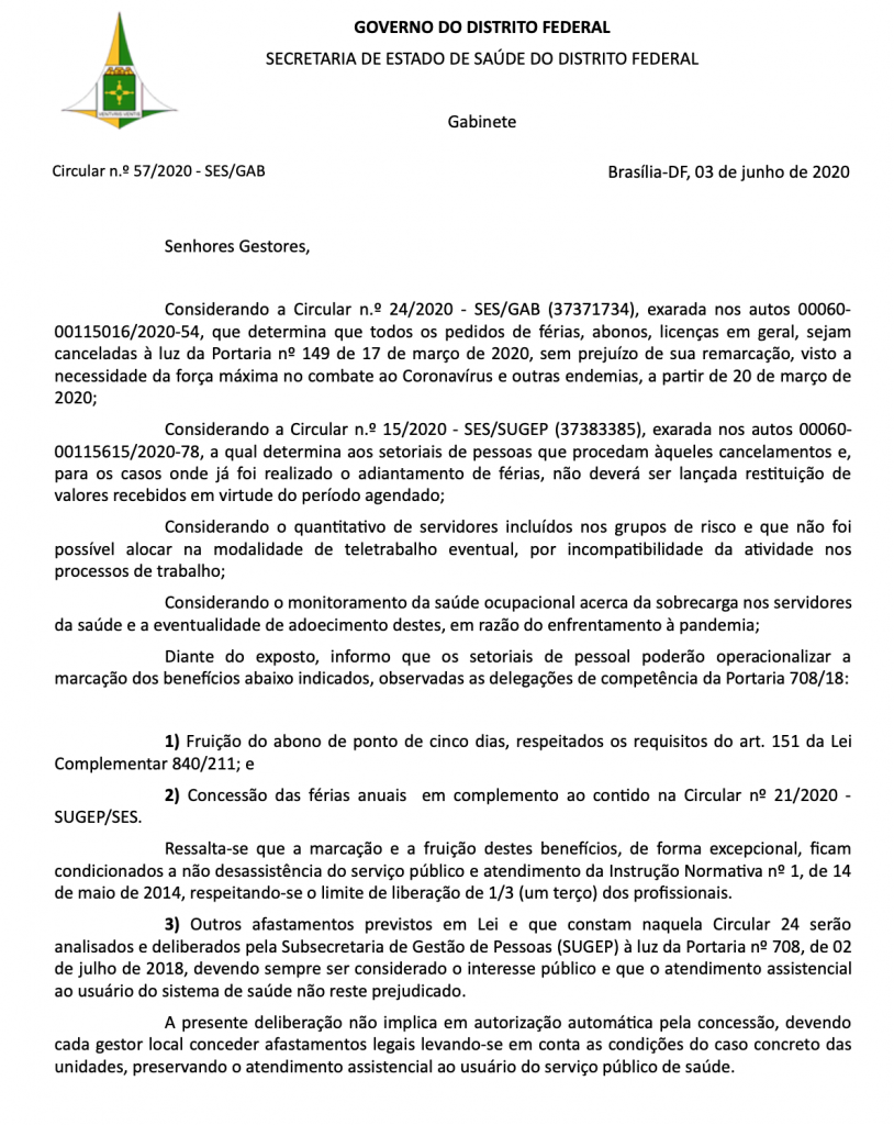 Foi divulgada nesta sexta-feira(5), a circular de nº 57/2020, que versa sobre a liberação de marcação de férias anuais e fruição do abono de ponto para profissionais da saúde.