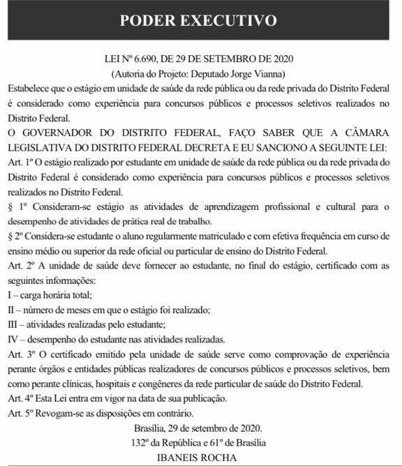 O deputado Jorge Vianna ( Podemos), conseguiu aprovar mais um projeto de lei em favor dos profissionais da saúde. A agora lei, nº 6.690 de 29 de setembro de 2020, estabelece que o estágio em unidades de saúde da rede pública ou rede privada do Distrito Federal passa a ser considerado como experiência para concursos públicos e processos seletivos realizados no Distrito Federal.