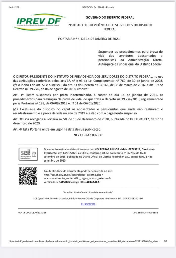 O Instituto de Previdência dos Servidores do Distrito Federal (Iprev-DF) decidiu suspender, nesta quinta-feira (14) por tempo indeterminado, a realização da prova de vida de aposentados e pensionistas do Governo do Distrito Federal (GDF). A medida atende a uma solicitação do deputado distrital Jorge Vianna (Podemos), que pedia em ofício ao presidente do Instituto, Ney Ferraz, a prorrogação da retomada do recadastramento anual dos beneficiários enquanto durar a pandemia.