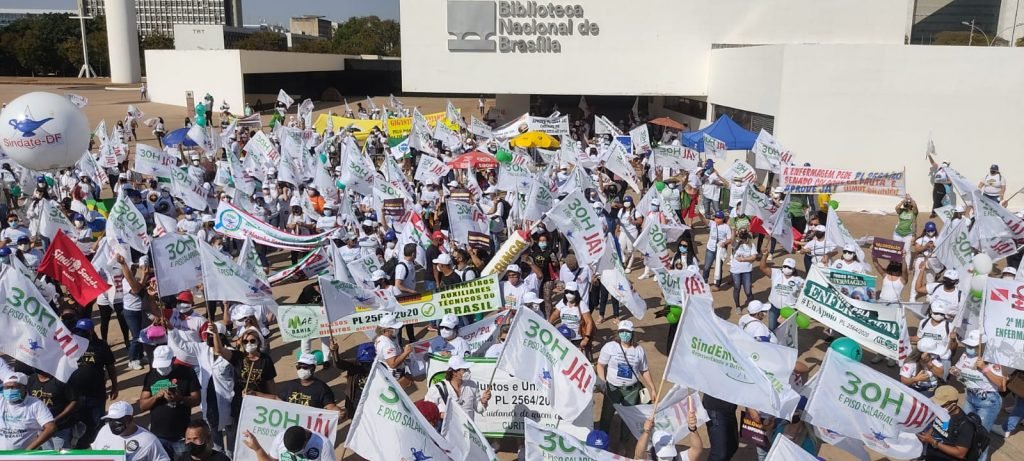 O dia 17 de agosto entrou para a história da Enfermagem. Profissionais de Enfermagem de diversos estados como Bahia, Minas Gerais, Rio de Janeiro, Piauí, Tocantins, Mato Grosso, Maranhão, Goiás, Paraná e Rio Grande do Sul estiveram na Esplanada dos Ministérios para participar da 2ª Marcha da Enfermagem, que tem como objetivo pressionar o Congresso Nacional para que coloque em pauta de votação o Projeto de Lei 2.564/2020 no qual é instituído o piso salarial fixo para a categoria e amplia a carga horária.