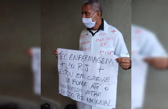 O técnico de enfermagem André Luiz Prazer decidiu fazer uma greve de fome até que ocorra a aprovação do PL 2564/2020, projeto que institui piso salarial fixo aos profissionais da categoria. Com um cartaz em punho, André veio de Nova Iguaçu, no Rio de Janeiro, para pressionar a aprovação da iniciativa que atualmente tramita pela Câmara dos Deputados.