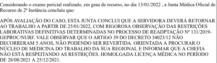Os advogados assessoraram os profissionais na criação de um recurso solicitando que os mesmos continuassem exercendo suas funções desde que, respeitadas as suas restrições de saúde. O pedido foi deferido e os servidores puderam retornar às suas atividades.