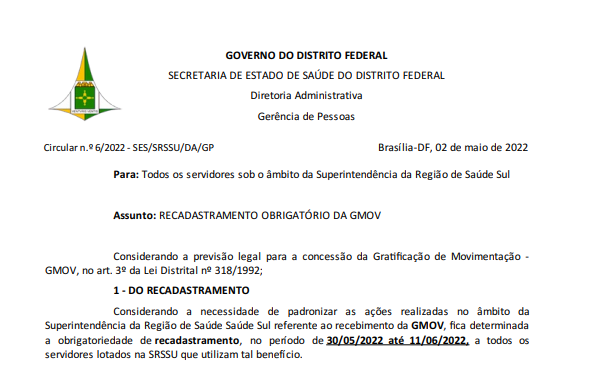 No começo desta semana a Secretaria de Saúde do Distrito Federal (SES-DF) publicou uma circular que informa sobre o recadastramento da Gratificação de Movimentação (GMOV).