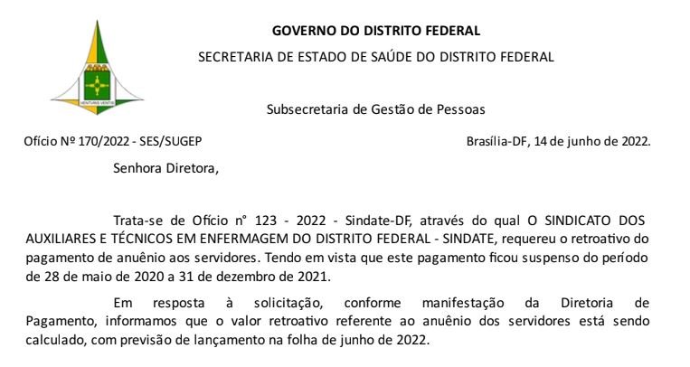 Em maio, o Sindicato dos Auxiliares e Técnicos em Enfermagem do Distrito Federal (Sindate-DF) requereu da Subsecretaria de Gestão de Pessoas (SUGEP) o retroativo do pagamento de anuênio aos servidores.