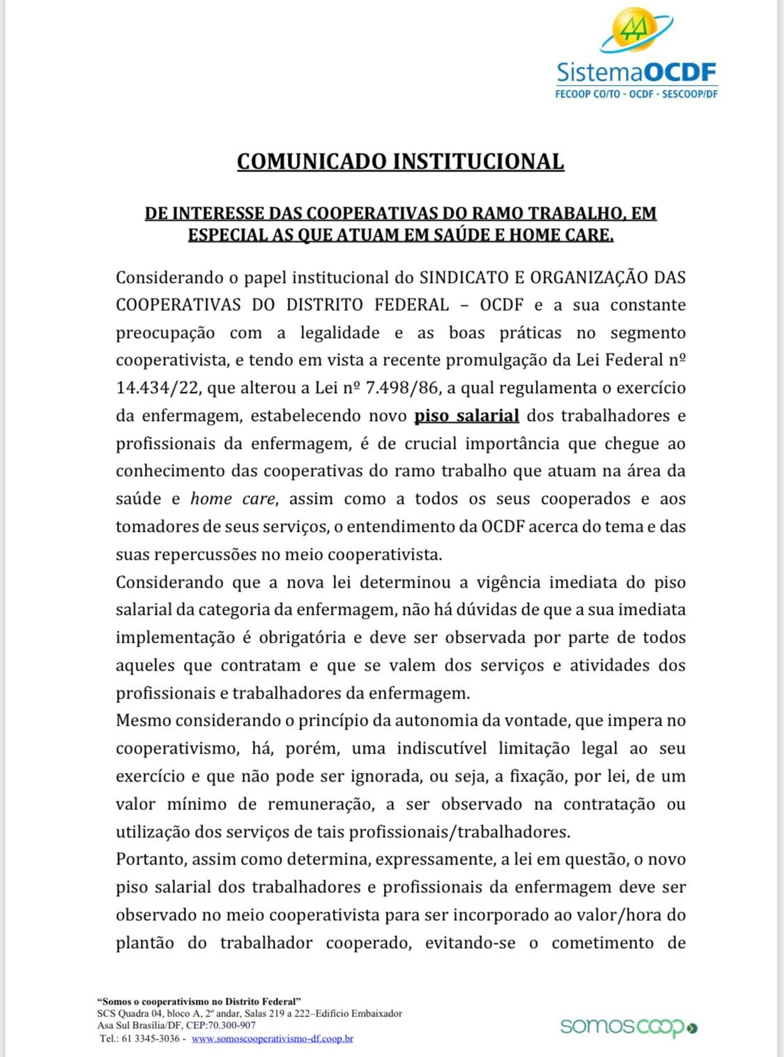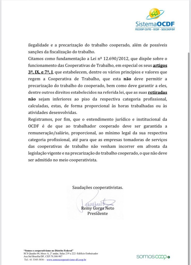 Na manhã desta sexta-feira (19/08), a Organização das Cooperativas do Distrito Federal (OCDF) emitiu uma nota onde afirma que a lei nº14.434/22 será cumprida de forma imediata, como determina em seu texto final.