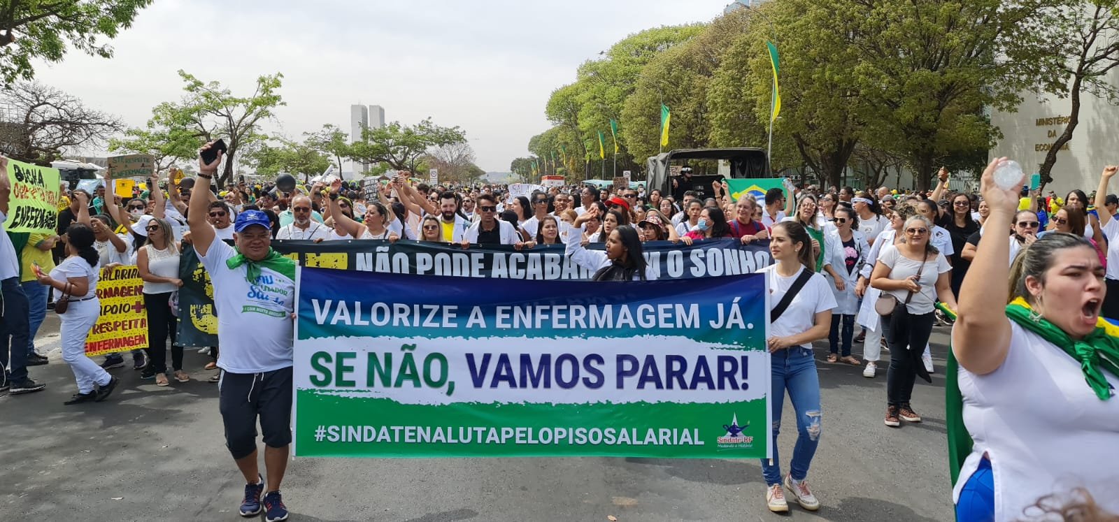 Na última quarta-feira (07/09), os diretores do Sindicato dos Auxiliares e Técnicos em Enfermagem do Distrito Federal (Sindate-DF) e o deputado Jorge Vianna (PSD) promoveram uma manifestação contra a suspensão do piso salarial da enfermagem.