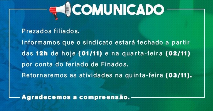 Compartilhar Facebook Twitter LinkedIn Pinterest Email Atenção filiados! Informamos que o sindicato estará fechado a partir das 12h de hoje (01/11) e na quarta-feira (02/11) por conta do feriado de Finados. Retornaremos as atividades na quinta-feira (03/11). Agradecemos a compreensão.