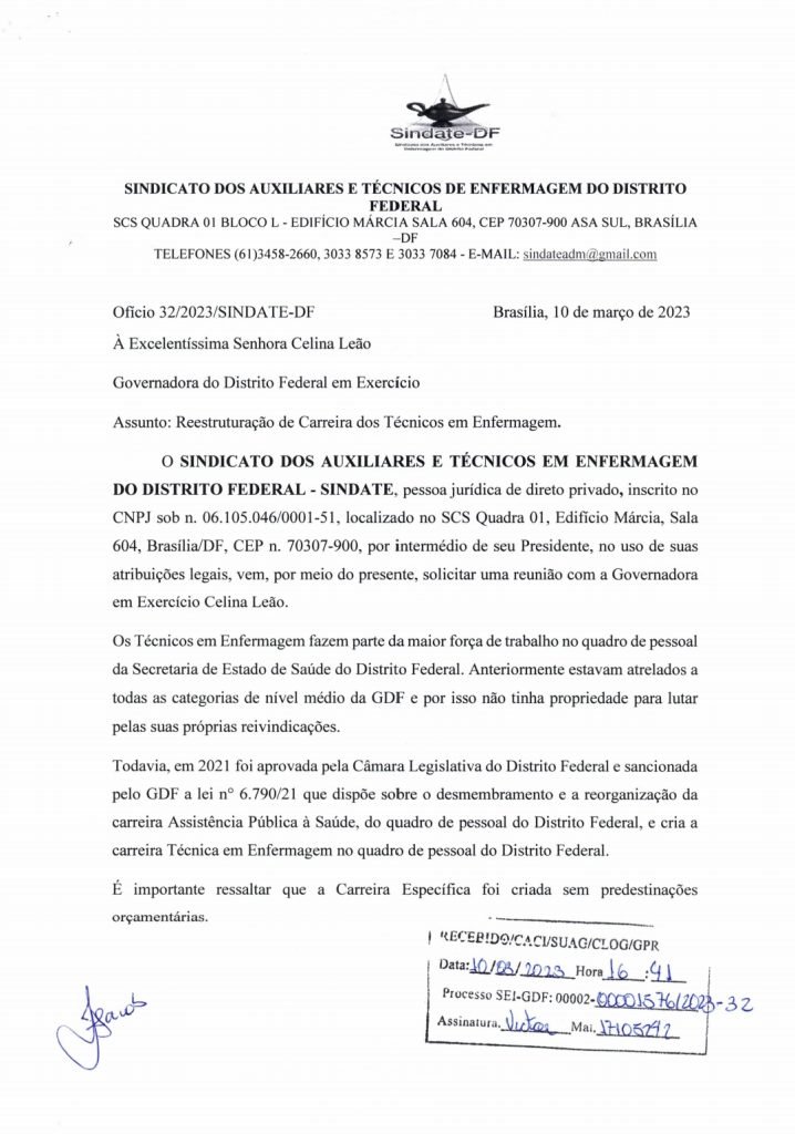 Desta forma, o Sindate iniciou na tarde desta sexta-feira (10/03) as negociações com o Governo do Distrito Federal e se reuniu com a governadora em exercício Celina Leão. Durante a reunião,onde estavam o diretor do Sindate Newton Batista e o deputado distrital Jorge Vianna (PSD) a governadora se comprometeu em enviar a tabela para a Secretaria de Economia visando revisar os cálculos e obter uma previsão orçamentária.