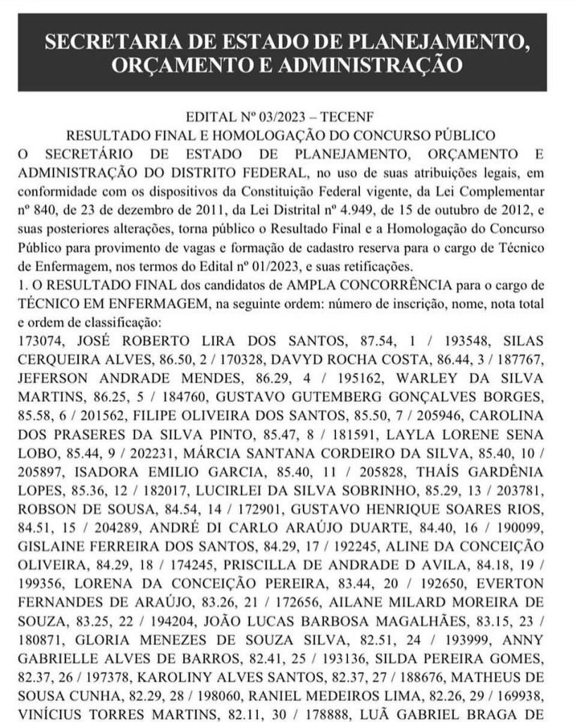 A Secretaria de Planejamento, Orçamento e Administração do Distrito Federal homologou, nesta terça-feira (12/12), o concurso para Técnico de Enfermagem da Secretaria de Saúde do DF, anunciando a decisão no Diário Oficial. Essa etapa representa um avanço significativo para a possível nomeação dos aprovados, atendendo a uma das principais reivindicações do Sindicato dos Auxiliares e Técnicos de Enfermagem do Distrito Federal (Sindate-DF).