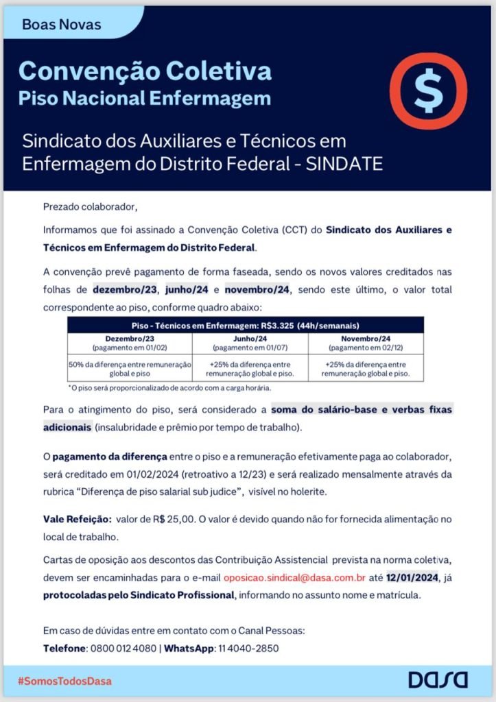 Após pressão do Sindate, as redes D’or e Dasa, mudam comunicado alterando a carga horária de 220 horas mensais para 44h semanais conforme acordo na CCT.