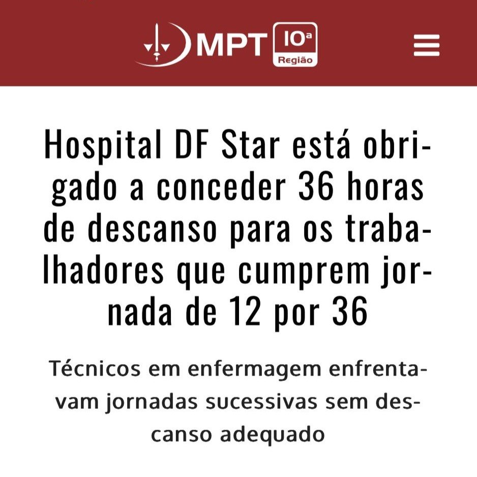 O juiz Francisco Luciano de Azevedo Frota da 3ª Vara do Trabalho de Brasília (DF) deferiu a liminar do Ministério Público do Trabalho no Distrito Federal (MPT-DF), representado pela procuradora Maria Nely Bezerra de Oliveira, proibindo que o Hospital DF Star exija ou permita qualquer atividade laboral nas 36 horas posteriores a cada plantão de 12 horas.