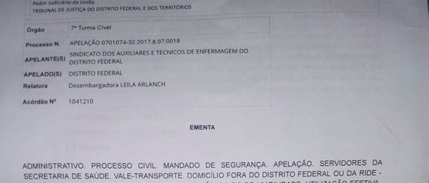 O departamento jurídico do Sindate, por meio do Tribunal de Justiça do Distrito Federal e dos Territórios (TJDFT), conseguiu anular o ato administrativo (circular nº 01/2017_GP/SRSSV) que determinava aos Servidores de outros estados, lotados no Hospital Regional de Santa Maria, que apresentassem os comprovantes de passagens mensais para obterem o auxílio transporte interestadual.