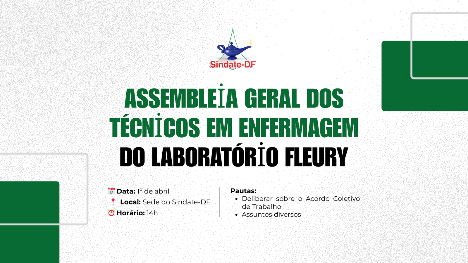 O Sindate convoca os Técnicos em Enfermagem do Laboratório Fleury para Assembleia Geral nesta terça-feira, 1º de abril, às 14h, na sede do sindicato.